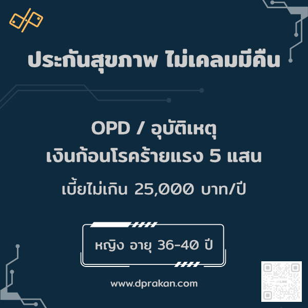 ประกันสุขภาพ ไม่เคลมมีคืน แผนนี้รวม OPD, IPD, อุบัติเหตุ และเงินก้อนโรคร้ายแรง 5 แสนบาทไว้ในฉบับเดียว นอกจากนี้ ยังมีส่วนลดปีถัดไปในกรณีที่ไม่มีการเคลม ซึ่งเหมาะอย่างยิ่งกับผู้หญิงวัย 36–40 ปีที่ต้องการความคุ้มครองครบและคุ้มค่าในระยะยาว