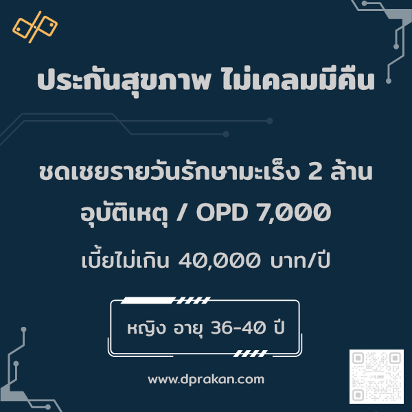 ประกันสุขภาพ ไม่เคลมมีคืน | OPD + อุบัติเหตุ7000 | มะเร็ง 2 ล้าน | ญ 36–40 ปี | AIA รหัส : 01F36MD01A0099